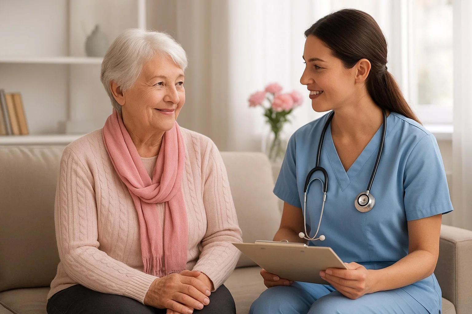 An elderly woman with silver hair sits on a comfortable sofa, wearing a soft cardigan, looking reflective but calm. A compassionate caregiver, dressed in neutral professional attire, sits beside her, gently offering comfort with a hand on her shoulder.